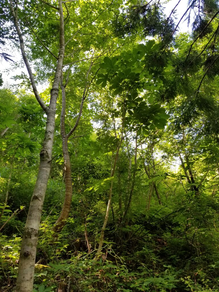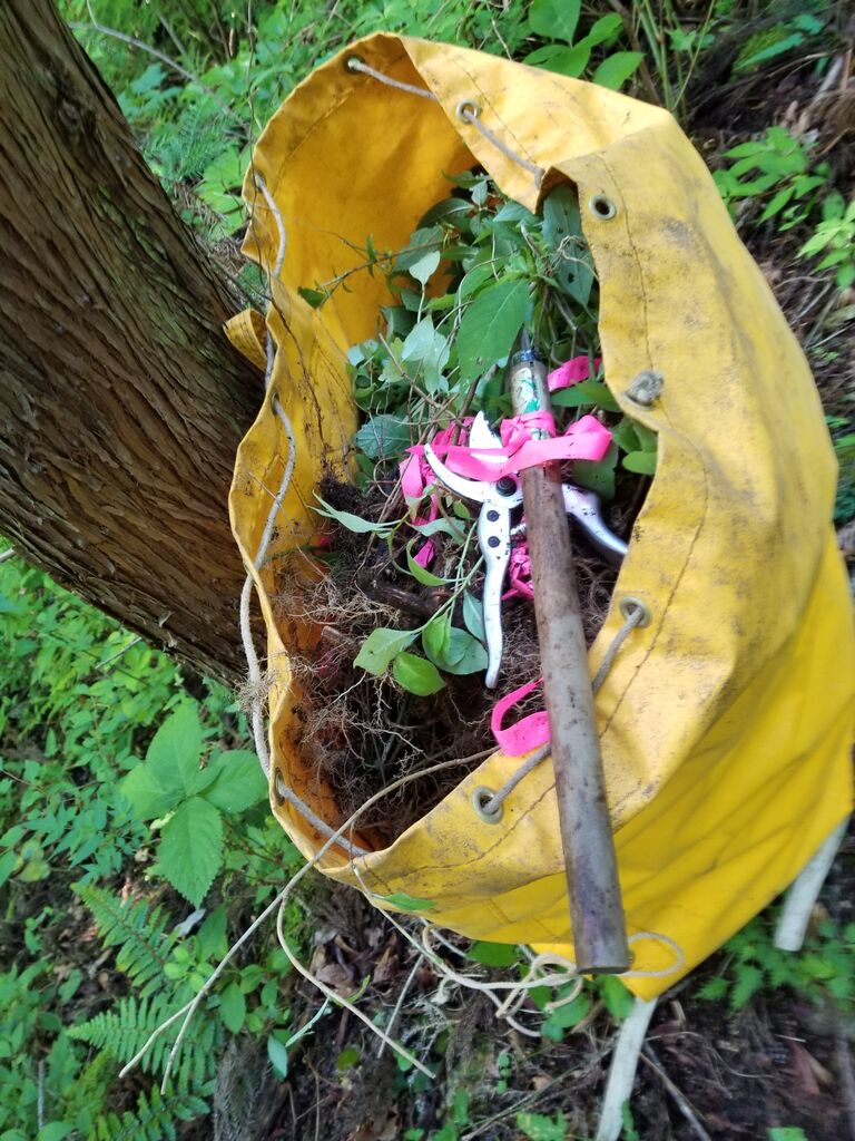 作業は、茨や、ススキを伐りながら、大事な、広葉樹の幼木や若木を傷つけないようにしながら、10センチ、15センチぐらいの所から、剪定をして、生葉を採取です。
