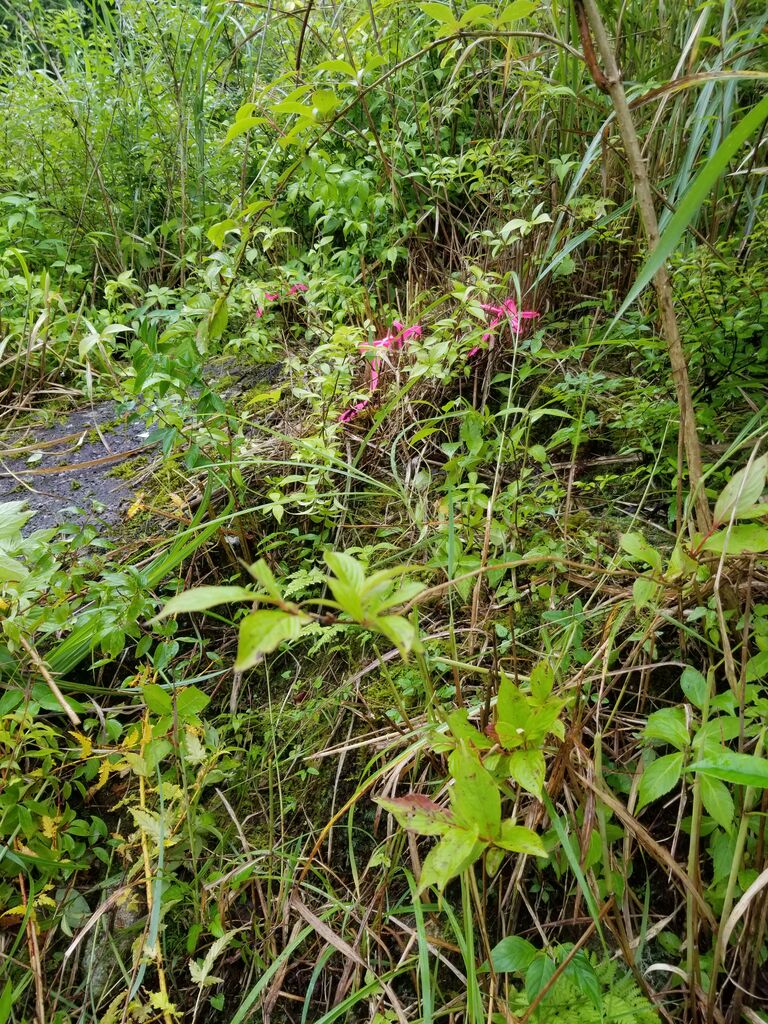 谷は、増水中で、渡る地点が、なかなか、決断できない。やっと、渡って、急坂を、鎌で草を刈りながら、甘茶のある地点にたどり着く。