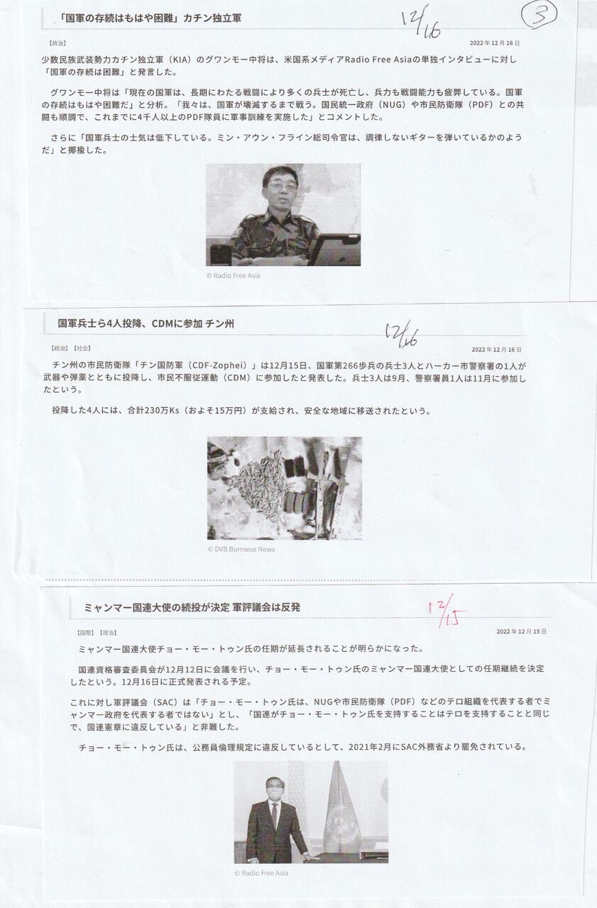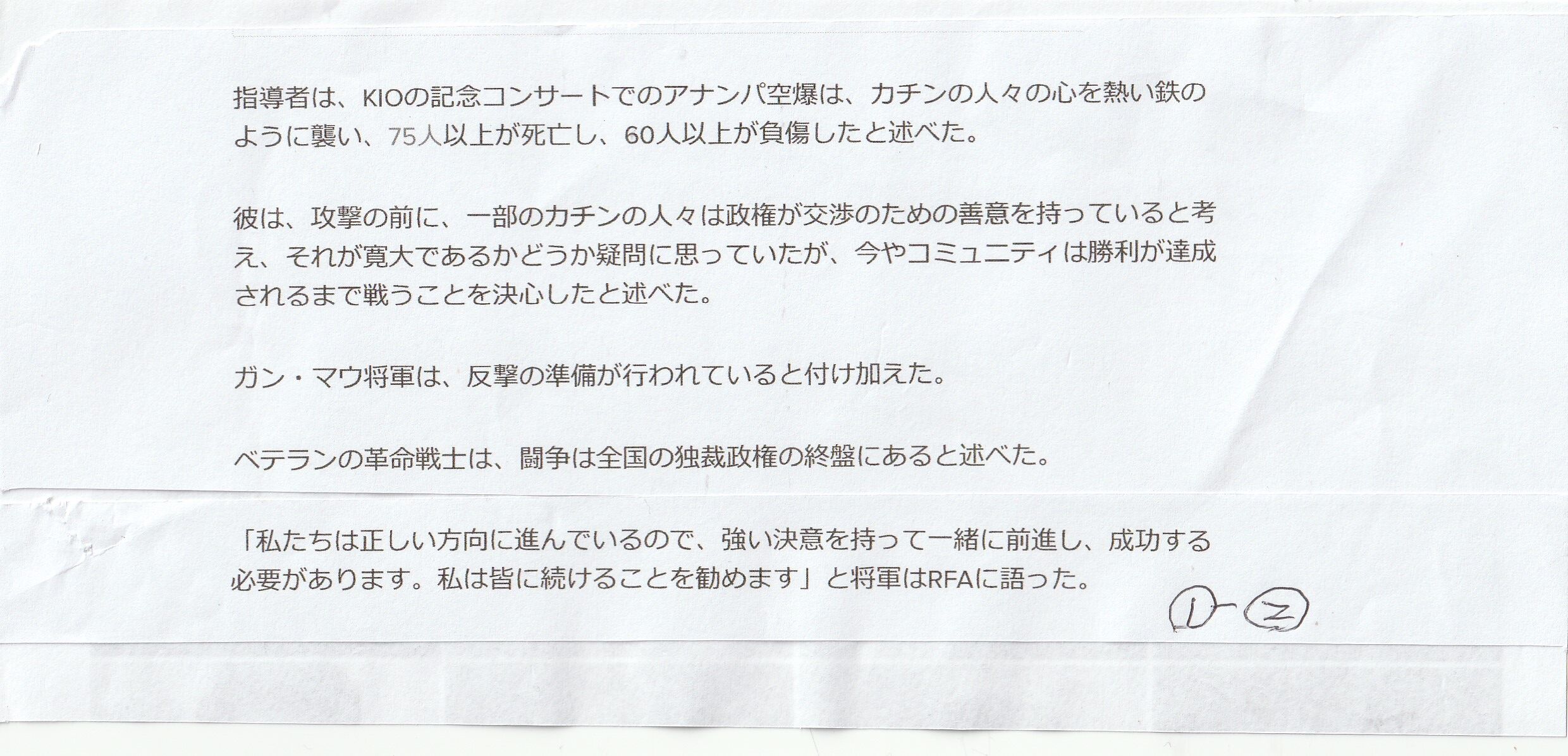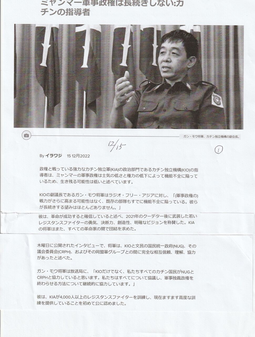 カチン独立軍の政治部門のカチン独立機構(KIO)の副議長であるガン・モウ将軍は、ラジオ・フリー・アジアのインタビューに答えた。これが12月15日に公開された。上のイラワジの記事は、それの紹介です。KIOは、記念コンサートで、国軍の空爆で、75人以上が殺され、60人以上が、負傷という打撃を受けている。=(アナンバ空爆)