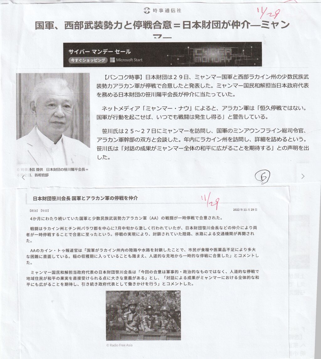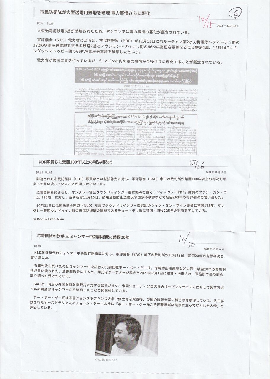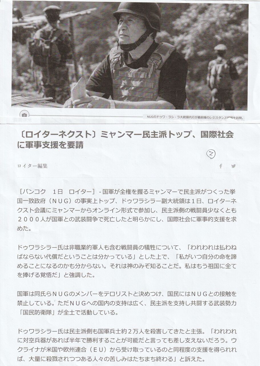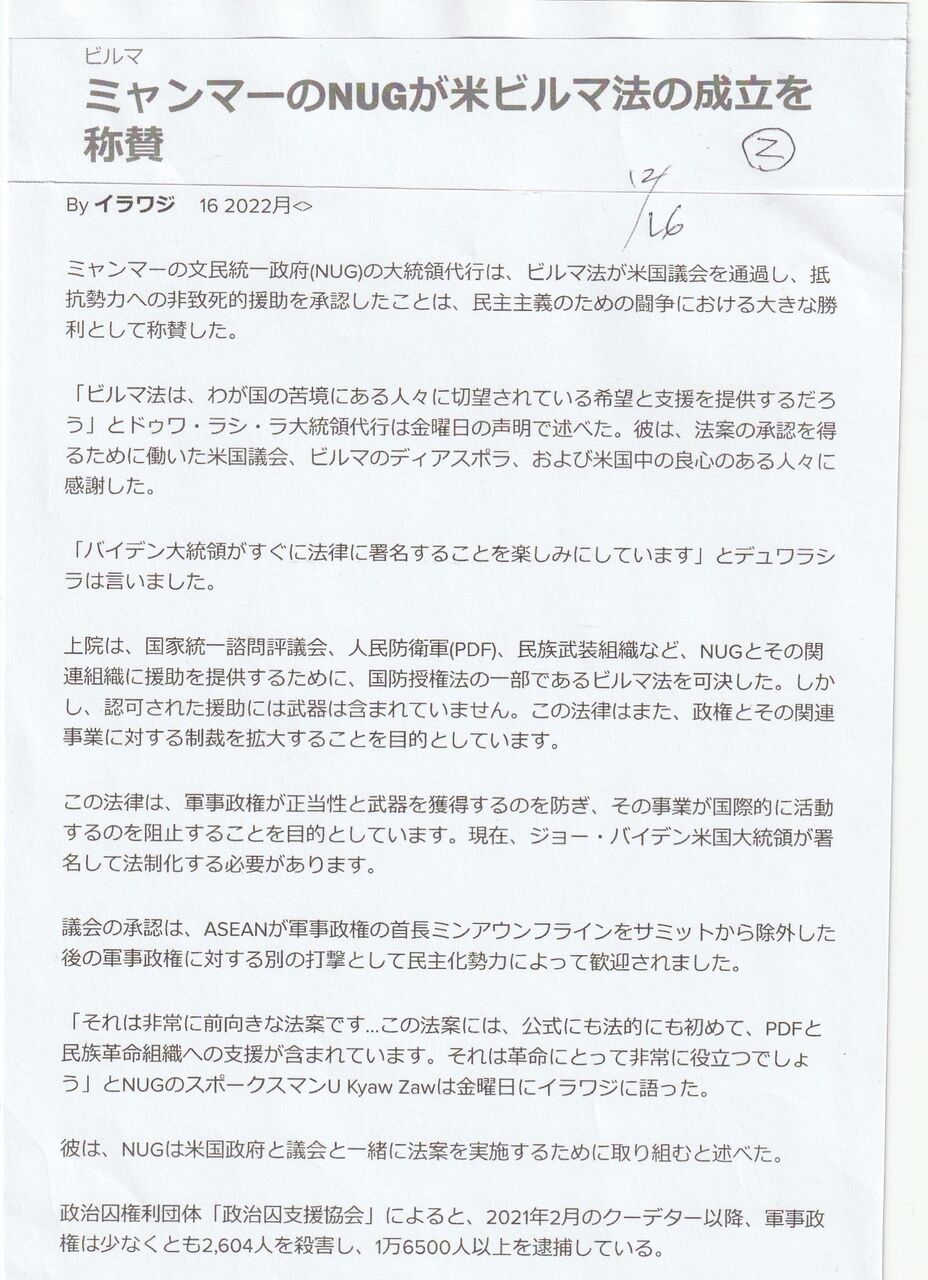 アメリカ議会は、「国家統一諮問評議会、人民防衛隊(PDF)、民族武装組織など、NUGとその関係する組織に援助を提供するためにビルマ法」を可決した。武器援助が含まれていません。